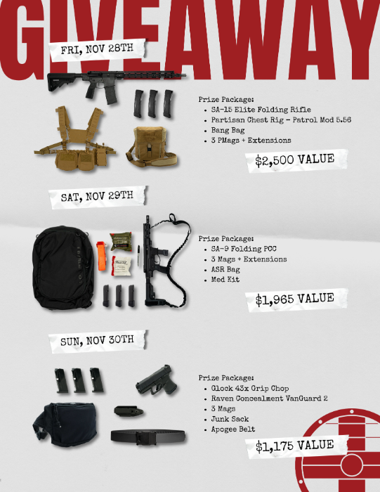 The Shield Arms Black Friday Sale runs November 27 through December 4, 2025, with daily giveaways on November 28th, 29th, and 30th. Don’t miss your chance to save on premium firearms accessories and enter to win over $5,600 in prizes!